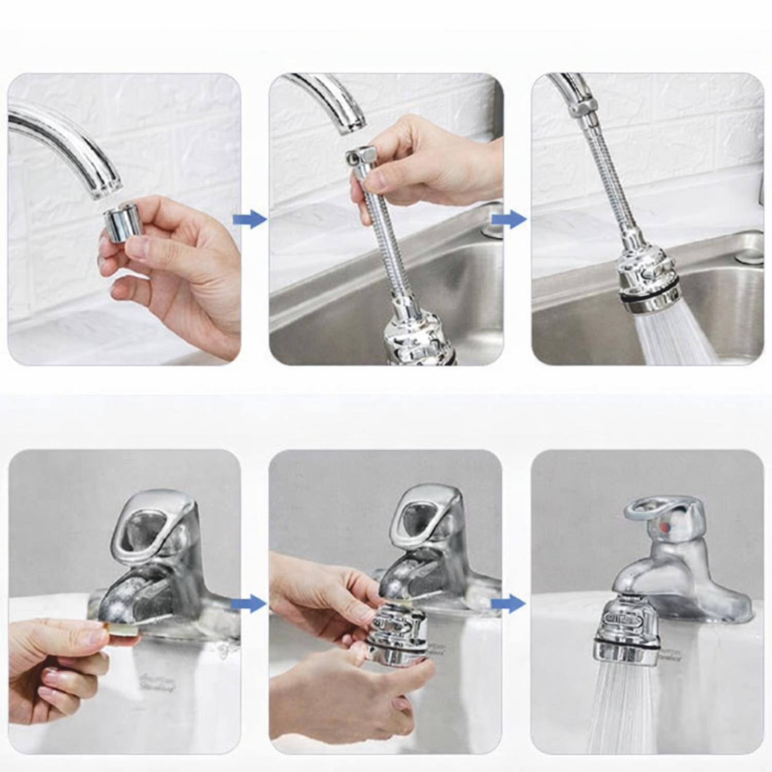 Select the correct adaptor for your faucet size from the 6 included: - A3 (15/16") — A4 (13/16") — A5 (M18.5) — A6 (M21.5) — B3 (55/64") — B4 (M18.5) Remove your faucet's existing aerator and screw on the matching adaptor. - Attach the Filter to Your Faucet