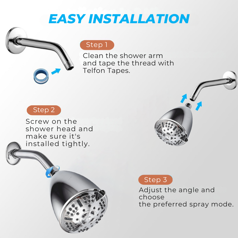 Al wat jy hoef te doen is om jou ou stortkop los te skroef en jou nuwe een met die loodgieter se kleefband vas te skroef! Geen gereedskap of loodgieter se hulp nodig nie. Boonop verseker die hoëgehalte-konstruksie maklike onderhoud.