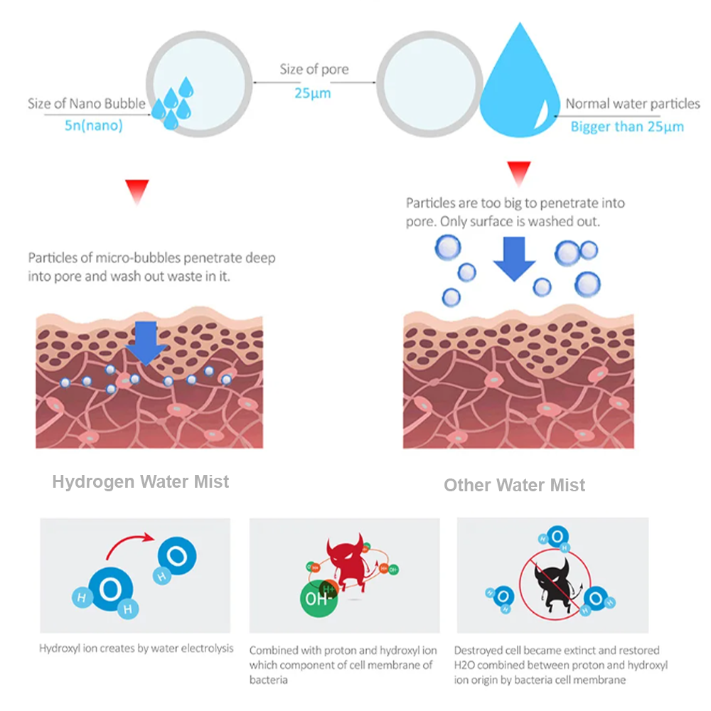- Mikrodeeltjie-bevordering: Nano-grootte waterstofborrels in die mis reinig en hidreer die vel diep deur porieë meer effektief te penetreer as gewone waterdeeltjies.