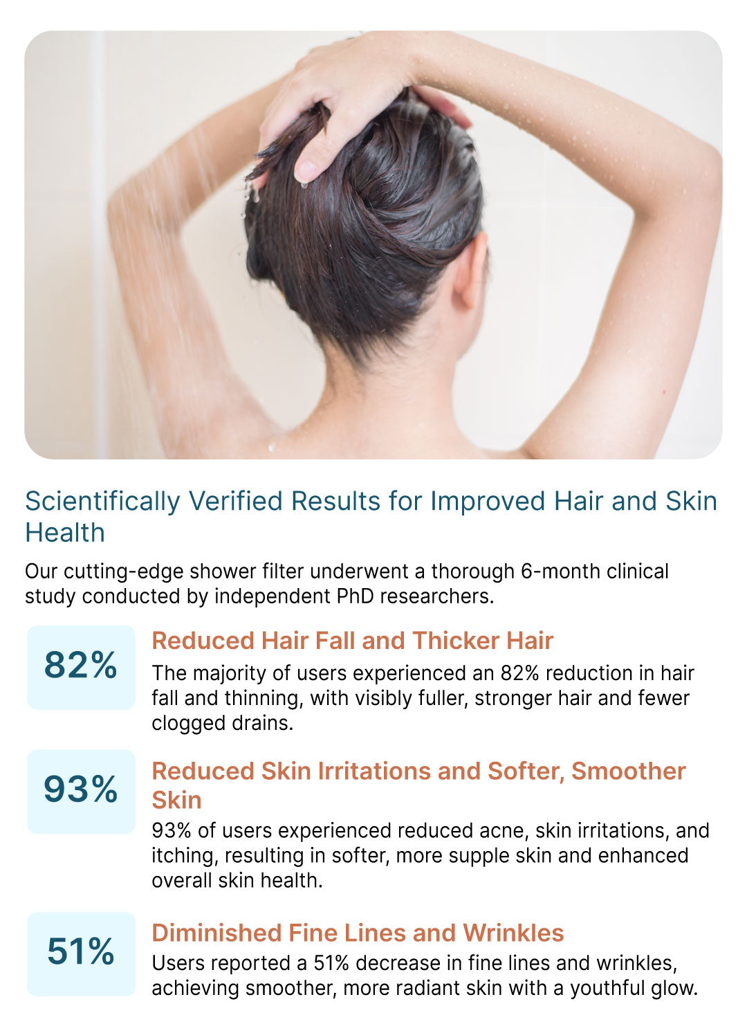 Our state-of-the-art shower filter was rigorously tested in a 6-month clinical study led by independent PhD researchers.